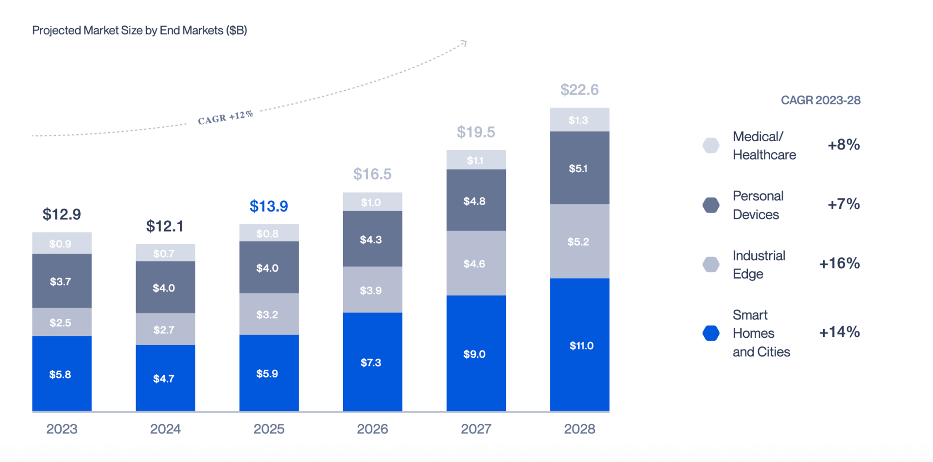 Smart Homes and Buildings: From biometric locks to voice-controlled systems, energy-efficient AI in the home is increasingly expected, not optional. This vertical is expected to double from $2.5B to $5.2B by 2028.⁶
