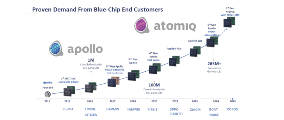 Today, Ambiq operates as a full-stack edge AI platform company—combining ultra-low power SoCs, edge-optimized software, and a growing product family including Apollo and Atomiq. Its solutions are increasingly deployed in critical applications across healthcare, manufacturing, smart homes, and mobility, where every milliwatt matters.