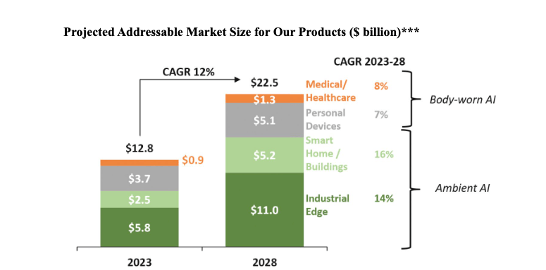 This market spans both Body-Worn AI and Ambient AI applications, including consumer wearables, digital health devices, smart homes, industrial IoT systems, and factory automation.