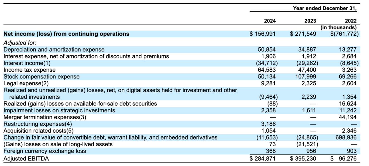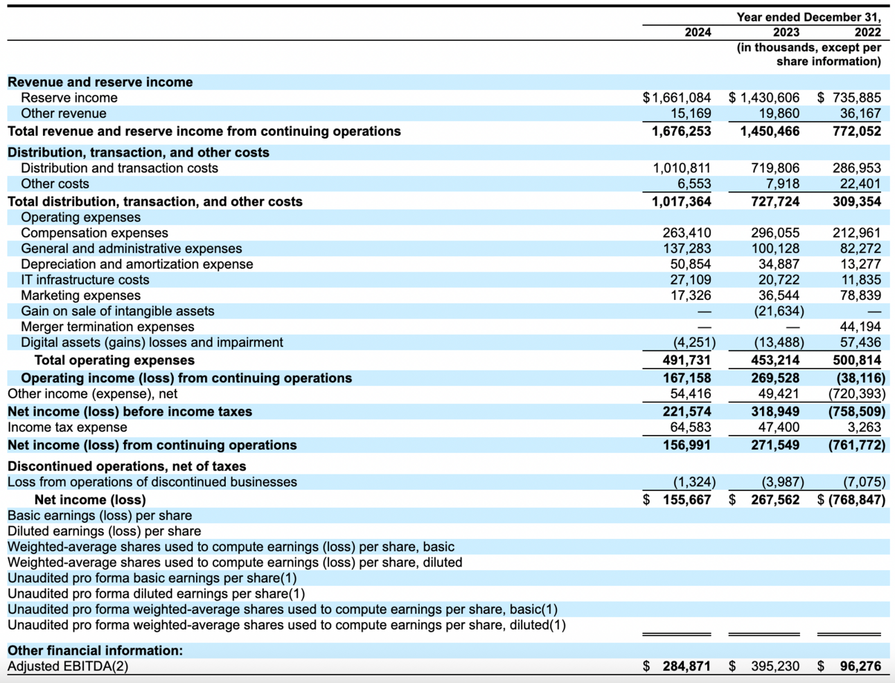 Circle's adjusted EBITDA for FY2024 was $285 million, down from $395 million in FY2023. The decline in profitability reflects heightened distribution costs, which reached $1.01 billion, alongside expanded R&D investments and marketing expenditures aimed at global market penetration and developer adoption. Nevertheless, Circle's gross margins remain solid, driven by the cost-efficient nature of blockchain-based transactions and fiat-backed reserves.