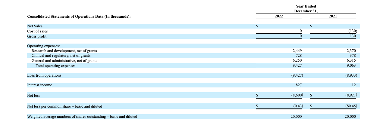 Despite efforts to manage costs, Cortigent reported net losses of $8.6 million in 2022 and $8.9 million in 2021. While losses remain significant, the $0.3 million improvement was driven by higher interest income from cash investments.