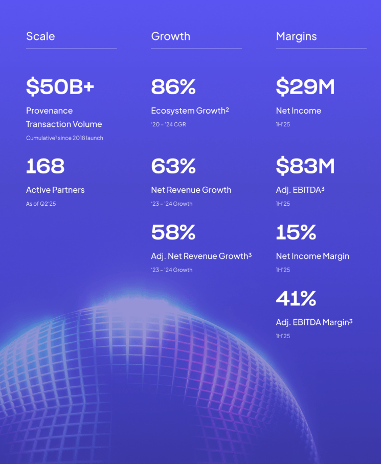 Operating Leverage: Adjusted EBITDA margin expanded 24% → 44% (H1 2024 to H1 2025) despite 22% revenue growth. Sustained margin expansion depends on limiting G&A while ecosystem fees compound.