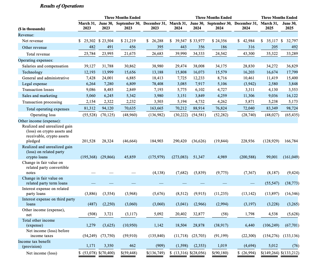 Gemini’s revenues fluctuate with crypto asset prices and trading volumes, making quarterly results inherently unpredictable. Net income losses of $(158.5)M in FY2024 and $(282.5)M in 1H2025 highlight the challenge of achieving profitability in a cyclical, sentiment-driven market. Any downturn in prices or activity can quickly translate into operating losses.