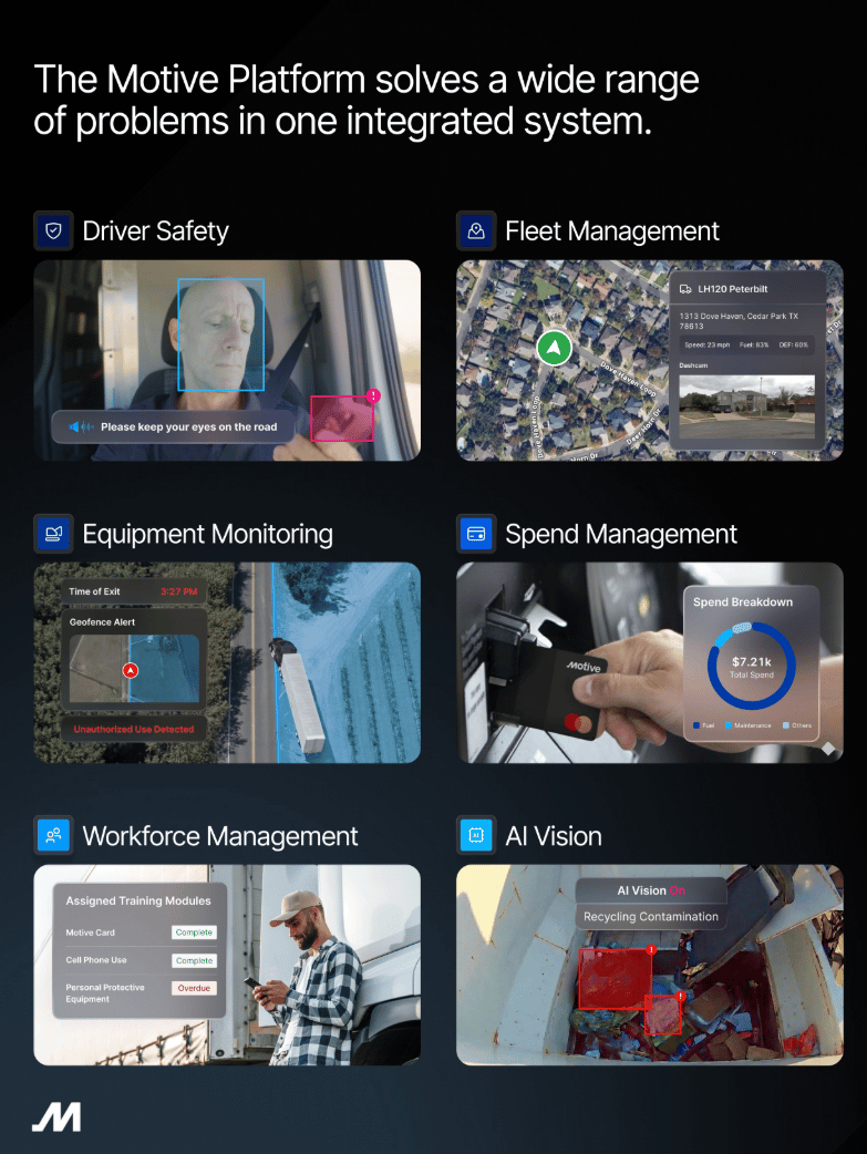 Motive's Integrated Operations Platform delivers six products unified by the Physical Operations Graph—a foundational data layer connecting workers, vehicles, equipment, and spend. This architecture eliminates the fragmented point solutions that burden fleet operators with siloed systems, manual workflows, and limited automation.