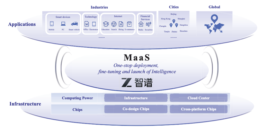 Full-stack infrastructure: Self-developed GLM framework → continuous model iteration → 40+ chip compatibility → flexible deployment