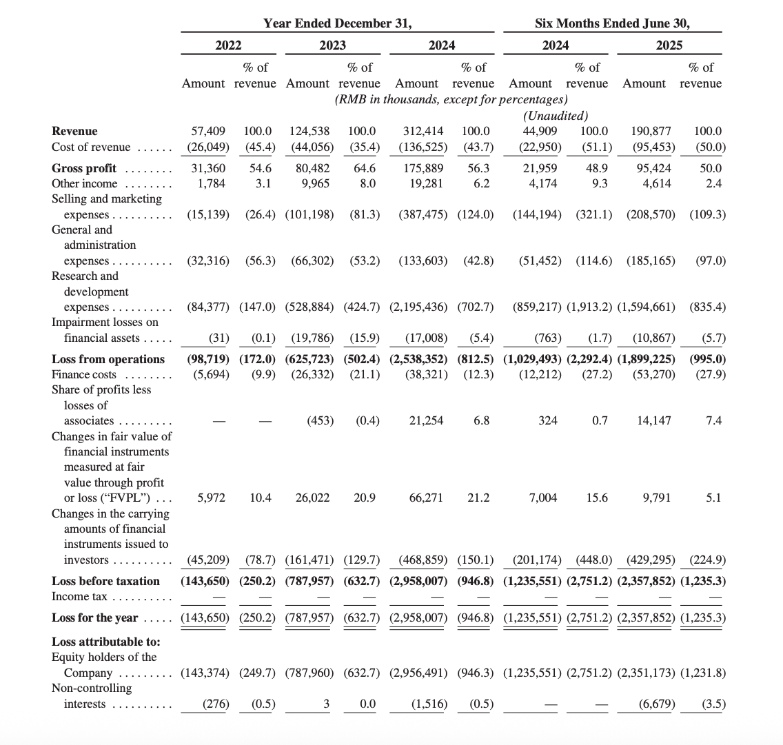 R&D Investment: RMB2,195M (2024), 702.7% of revenue; RMB1,595M (H1 2025), 835.4% of revenue—reflecting foundation model development intensity.