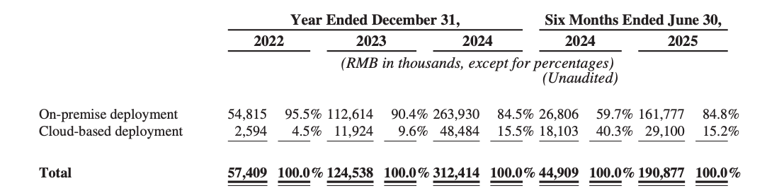 Mix: On-premise deployment 84.8% of revenue (H1 2025); cloud-based deployment 15.2% (growing from subscription and usage-based models).