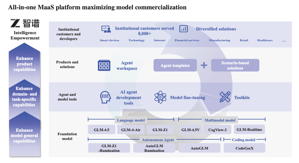 What started as foundational research evolved into vertically integrated AI infrastructure. Zhipu launched GLM in 2021—China's first proprietary pre-trained large model framework—then open-sourced GLM-130B in 2022, proving the technology worked at scale. Product expansion accelerated: from foundation models to multimodal systems, autonomous agents, and coding assistants—with institutional customers growing to over 8,000 by June 2025.